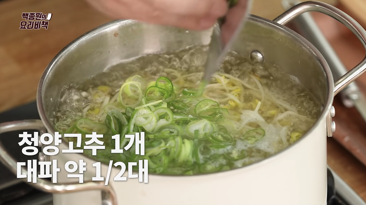 약 5분간 더 끓인 후, 대파 1/2과 청양고추 1개를 넣고 1분 정도 더 끓이면 콩나물국이 완성됩니다.