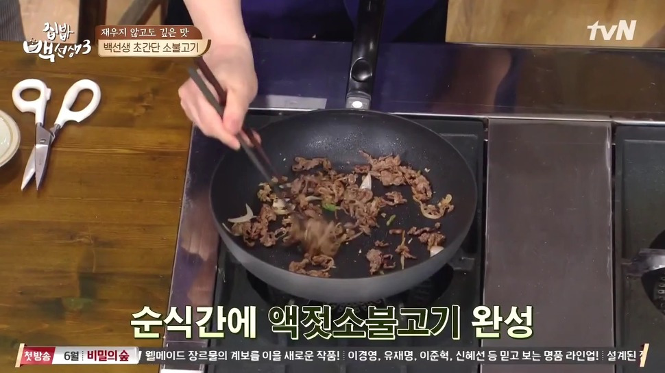 양념된 불고기는 달군 팬에 넣어 구우면 됩니다. 이때 기름을 따로 두를 필요는 없다고 해요.
