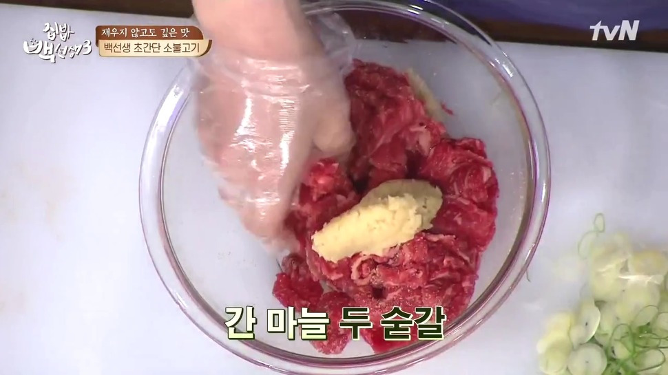 3. 잘 버무린 소고기 불고기에 간 마늘 2스푼을 넣고, 송송 썬 대파 한 줌과 액젓 4숟갈을 추가해주세요.
