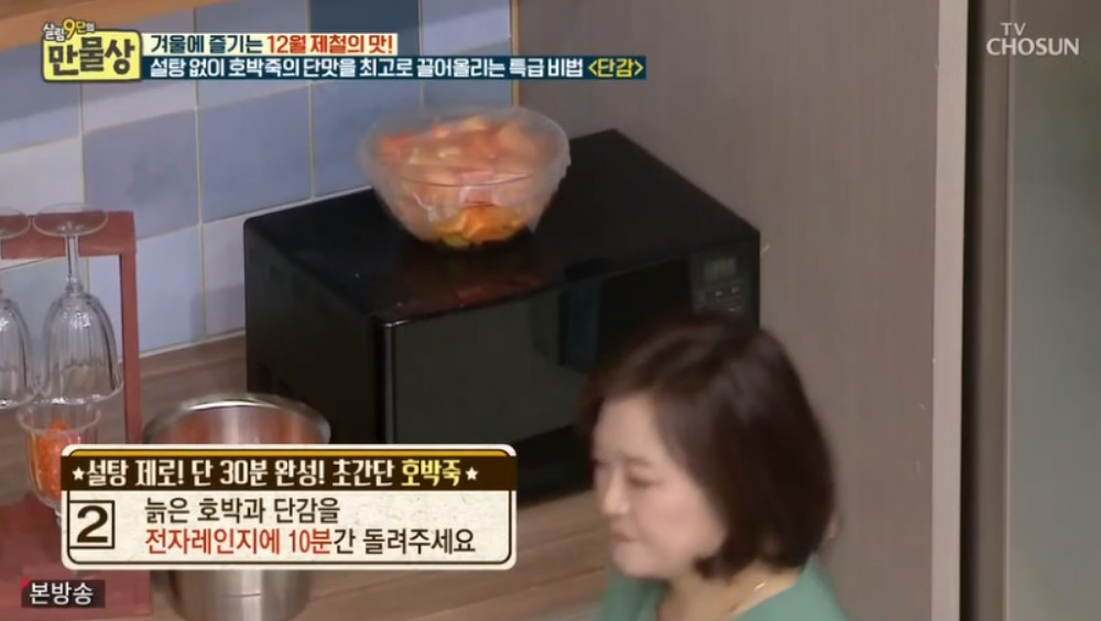 손질한 늙은 호박과 단감을 전자레인지에 10분간 돌려주세요. 이렇게 하면 수분이 설탕물처럼 빠져나오게 됩니다.
