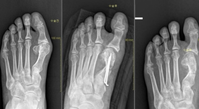 초기 단계에서는 건막류(두꺼운 혹)를 절제하는 건막류절제술을 시행합니다. 돌출된 건막류를 절제하여 각도를 교정하고, 짧아진 근육이나 연부조직을 늘려주는 비교적 간단한 수술입니다. 다른 발가락의 변형이 동반되거나 뼈의 과잉 성장이 심한 경우에는 뼈를 깎고 방향을 돌린 뒤 발가락이 똑바로 펴지도록 철사로 고정하는 교정절골술을 시행합니다. 양쪽 발이 모두 변형된 경우, 대개 한 번에 한쪽만 수술합니다.