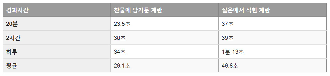 차가운 물에 담가둔 계란의 껍질을 벗기는데 걸린 평균 시간은 29.1초로, 실온에서 식힌 계란보다 약 20초 정도 빨랐습니다. 또한, 실온 보관한 계란은 시간이 지나면서 껍질을 벗기는데 시간이 점점 더 오래 걸리는 반면, 차가운 물에 20분간 담가둔 계란은 시간이 경과해도 여전히 빠르게 껍질이 벗겨졌습니다. 결론적으로, 계란을 삶은 후 차가운 물에 약 20분간 담가두면 껍질을 예쁘고 빠르게 벗길 수 있습니다. 참고로, 찬물에 담그기 전에 계란 껍질을 살짝 깨서 넣으면 찬물이 빠르게 퍼져 껍질 벗기기가 더 수월해진다고 합니다.