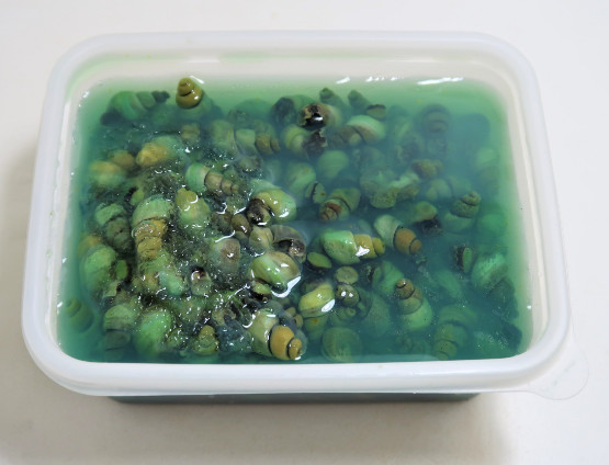 ④ 손질을 마친 후 다시 맑은 물에 10분 정도 담가 다슬기 살이 껍질에서 나오도록 해줍니다.