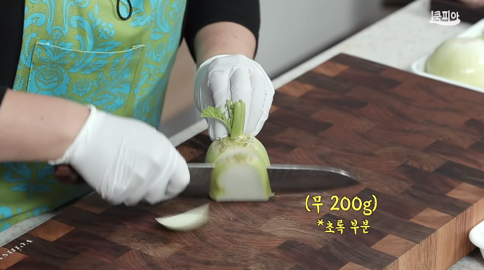 (1) 무 초록 부분 200g을 납작하게 썰어 냄비 바닥에 깔아준다.