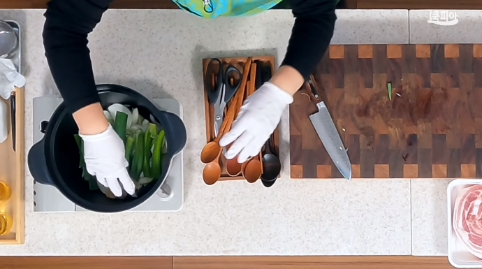 (7) 돼지고기를 넣고 물이 다시 끓으면 뚜껑을 덮어 센 불에서 10분, 중약 불에서 40분간 끓인다.