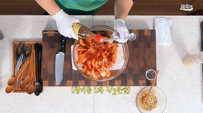 ▶ 배추김치 1/4통 ▶ 고춧가루 1큰술 ▶ 국간장 1작은술 ▶ 매실청 1큰술 ▶ 참기름 1과 1/2큰술 ▶ 깻가루 1큰술 ▶ 통깨 1큰술