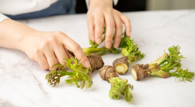두릅은 다른 산나물에 비해 떫은 맛이 적어서 튀김으로 먹을 때는 떫은 맛이 필요 없어요. 하지만 무침이나 나물 요리로 할 때는 떫은 맛이 어느 정도 있어야 더 맛있게 즐길 수 있습니다. 먼저 두릅을 씻은 후, 줄기 부분을 감싸고 있는 ‘하카마’라는 껍질을 벗기세요. 뿌리 쪽 갈색 부분을 조금 잘라내면 자연스럽게 벗겨집니다.