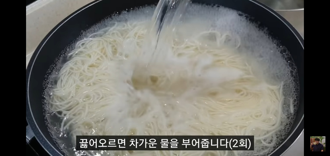 끓는 물에 소면 2인분을 삶아 주세요. 물이 끓어오르면 찬물을 부어 주면 국수 면발이 더욱 탱탱해집니다. 이 과정을 두 번 반복해 주세요.