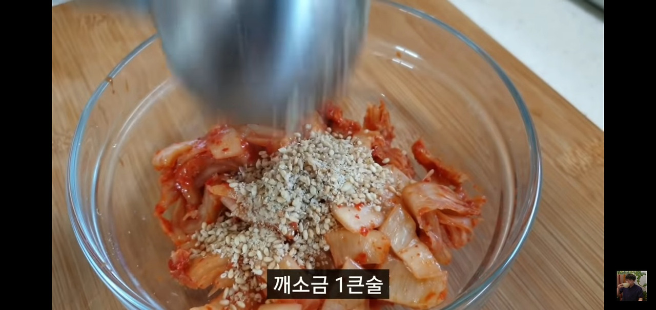 썰어 둔 신김치에 참기름 1스푼과 깨소금 1스푼을 넣고 살짝 무쳐 주시면 김치가 훨씬 맛있어집니다!