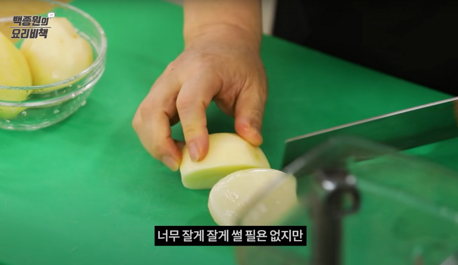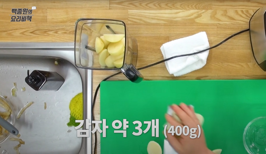 감자는 잘 갈리도록 알맞은 크기로 썰어 주시면 되는데, 이때 감자만 넣고 믹서기를 돌리면 잘 갈리지 않아요.