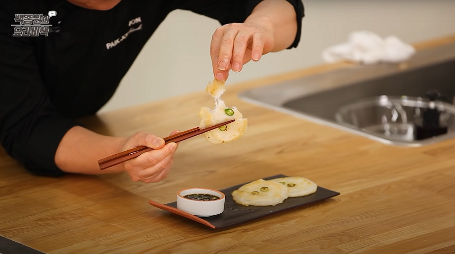 11. 노릇하게 부친 감자전을 양념장에 찍어 드세요. 양념장 비율은 보통 간장 : 식초를 1 : 2로 많이 쓰지만, 감자전 양념장은 1 : 3 비율을 권한다고 해요.