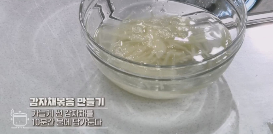 2. 가늘게 썬 감자채를 10분간 물에 담가서 전분기를 빼주세요. 감자의 전분기를 빼줘야 아삭한 식감이 살고 맛이 깔끔해진다고 해요.