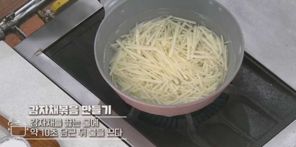 10. 감자채를 오래 볶으면 감자가 물러지기 때문에 빨리 볶아줘야 해요.