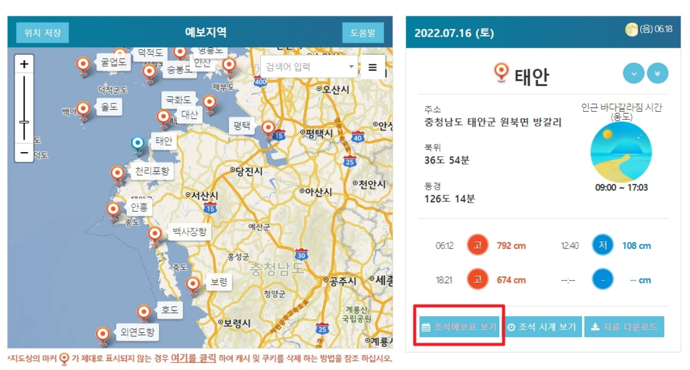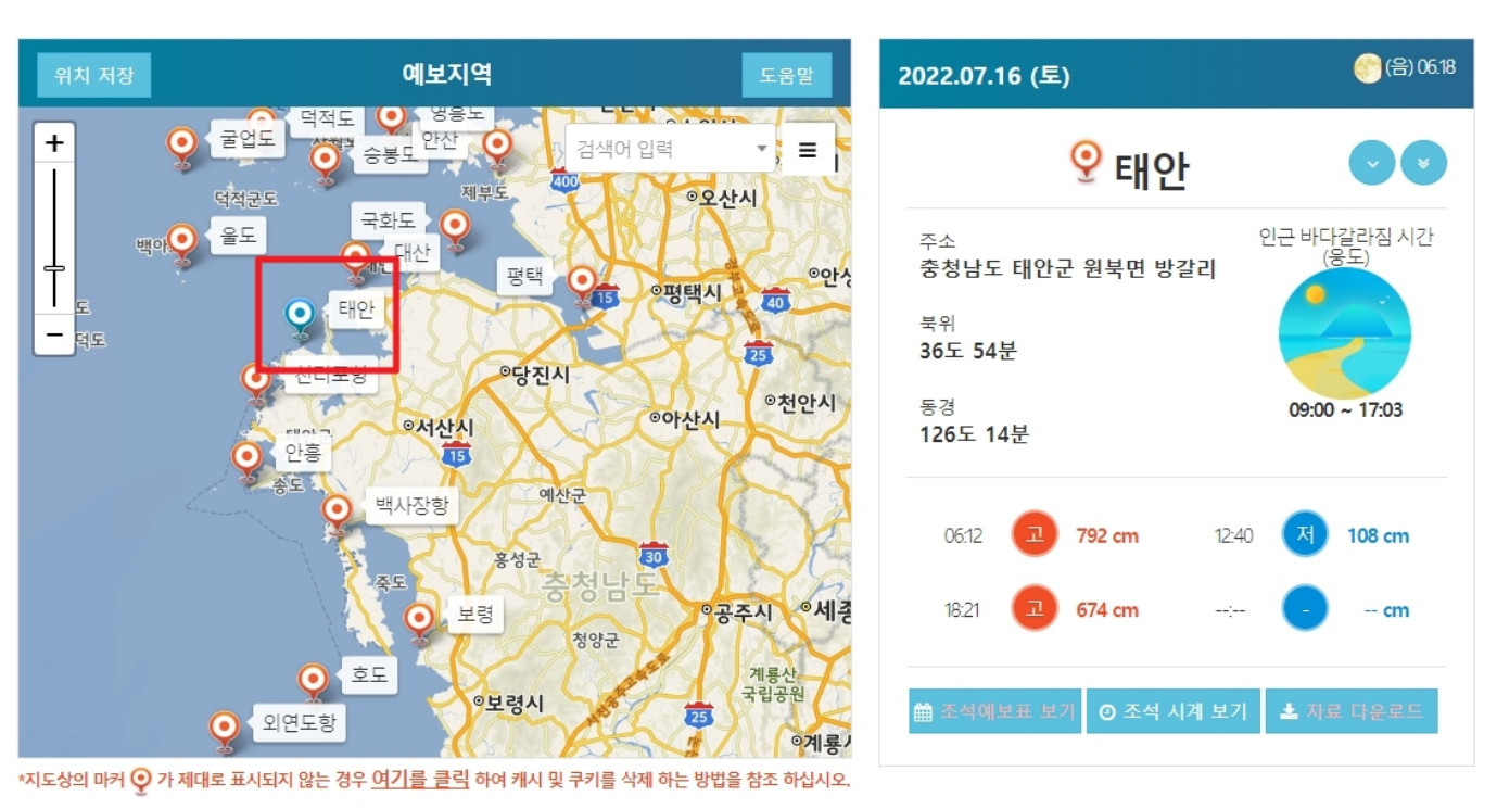 먼저 국립해양조사원 사이트를 방문하시면 아래 그림과 같이 지도가 뜨는데, 여기서 확인하고자 하는 지역을 선택하시면 해당 지역의 정보가 뜨게 돼요. 예를 들어 태안을 놀러간다고 가정하고 검색을 하면 다음과 같은 결과가 나와요.