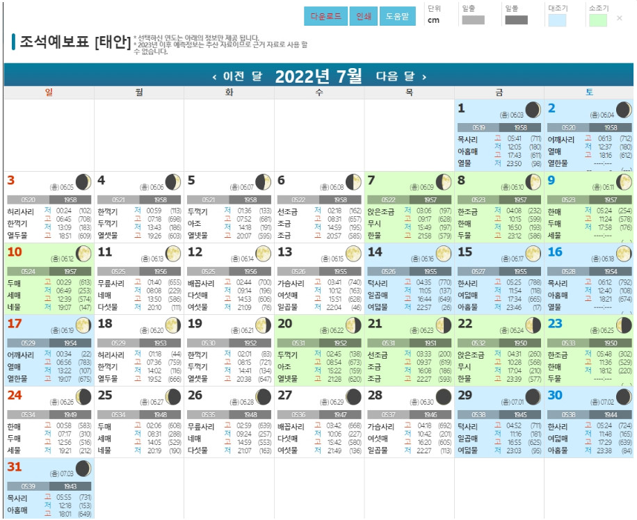 서해안 물때표 확인 방법 ③ 주간 서해안 물때