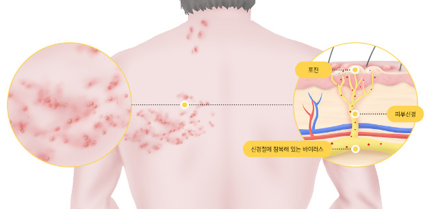 | 물집이 생기기 전 몸에 통증이 일어난다. |