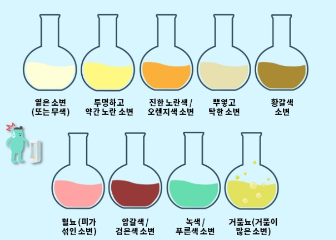 소변의 색깔은 질환, 식사, 복용 중인 약에 따라 변할 수 있기 때문에, 보통과 다른 색의 소변이 항상 질병을 나타내는 것은 아닙니다. 그렇다면 어떤 소변색이 주의가 필요할까요? 중요한 신호로 삼아야 하는 색은 빨간색(혈뇨), 갈색, 흰색(탁한), 무색(투명)한 색입니다.