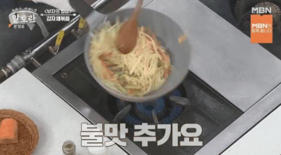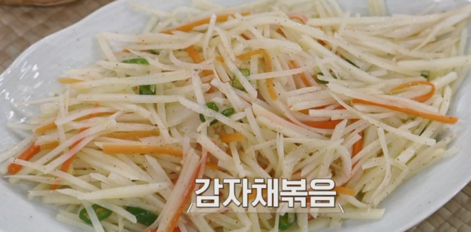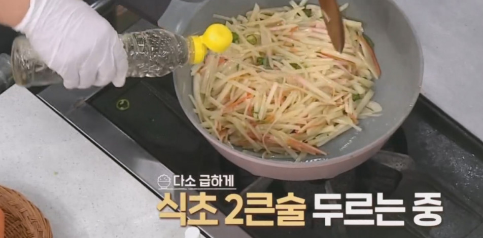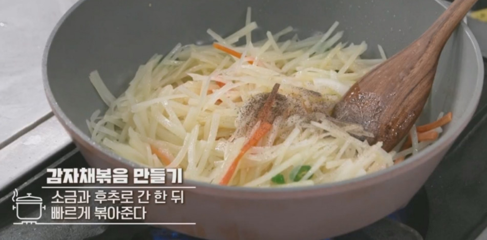 10. 감자채를 오래 볶으면 감자가 물러지기 때문에 빨리 볶아줘야 해요.
