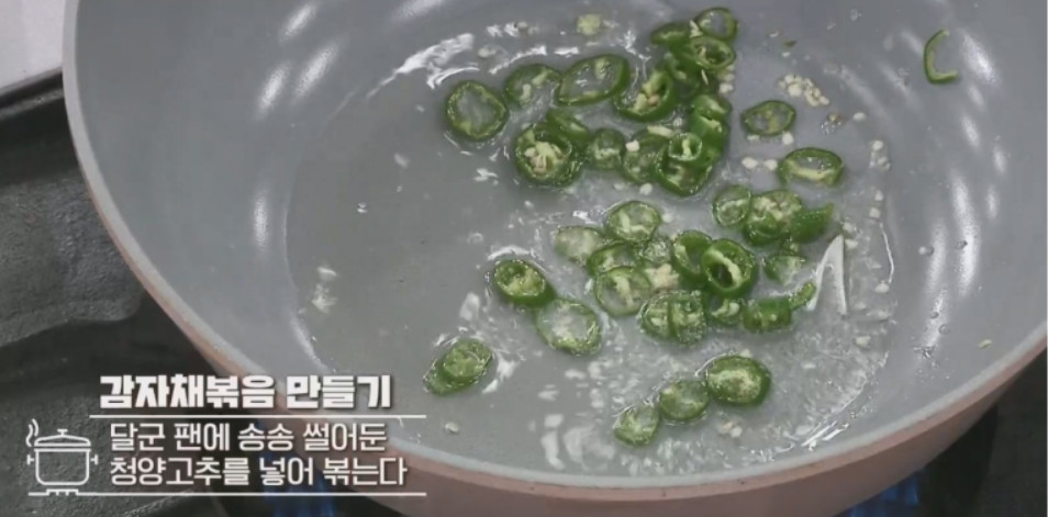 7. 팬에 식용유를 두르고 달궈준 후 송송 썰어둔 청양고추를 넣어 볶아주세요.