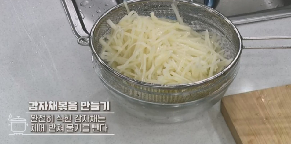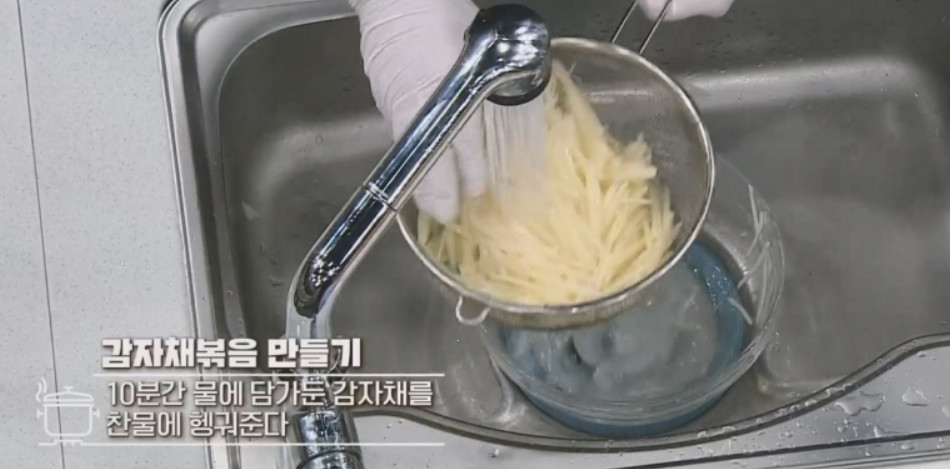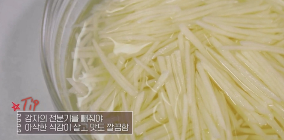 2. 가늘게 썬 감자채를 10분간 물에 담가서 전분기를 빼주세요. 감자의 전분기를 빼줘야 아삭한 식감이 살고 맛이 깔끔해진다고 해요.
