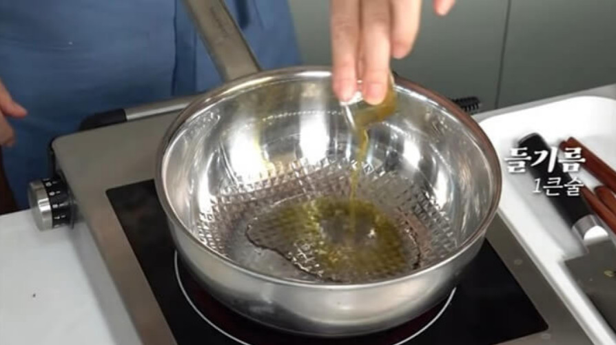 팬에 식용유 1큰술과 들기름 1큰술을 함께 두르고 달궈주세요. 식용유와 들기름이 바글바글 끓을 때 양념한 고구마순을 넣어줍니다.