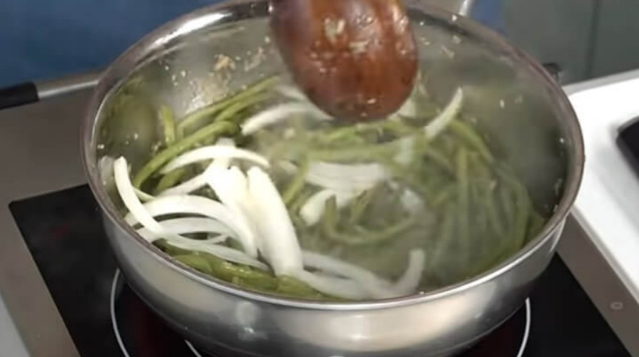 3~4분 정도 볶아준 후, 양파를 채 썰어 넣고 함께 볶아주세요. 3~4분 정도 볶아도 고구마줄기가 충분히 부드러워지지 않는 경우가 많아요. 나물로 먹는 고구마줄기 볶음은 부드러워야 더 맛있으니, 필요하다면 볶는 시간을 조금 더 늘려주세요. 이렇게 하면 고구마줄기가 부드럽고 맛있게 익어 더욱 맛있는 요리가 될 거예요!
