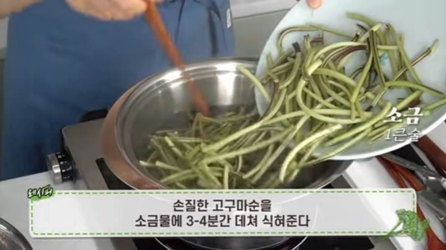 냄비에 물을 넣고 끓인 후, 소금 1큰술을 추가해 손질한 고구마줄기를 넣어줍니다. 끓는 물에 고구마줄기를 3~4분 정도 데쳐주세요.