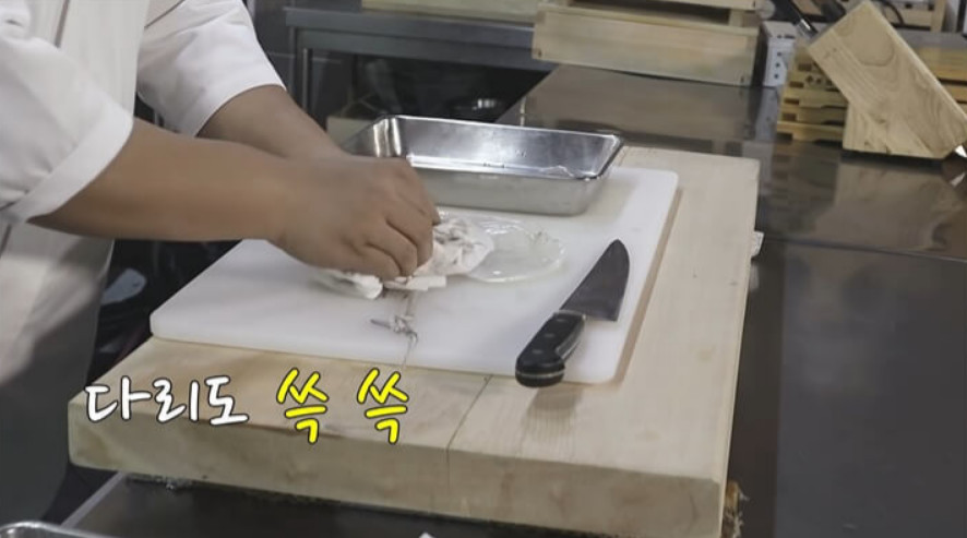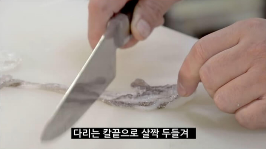다리의 두꺼운 부분은 칼끝으로 살짝 두드리면 부드러워지고, 씹을 때 오독오독한 식감이 더욱 좋아집니다.