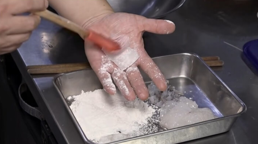 오징어튀김을 바삭하게 만드는 세 번째 단계는 튀김가루를 만들어서 묻히는 것입니다.