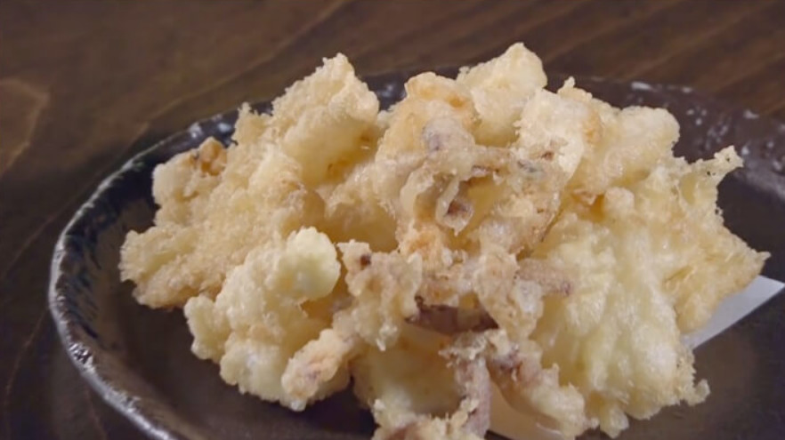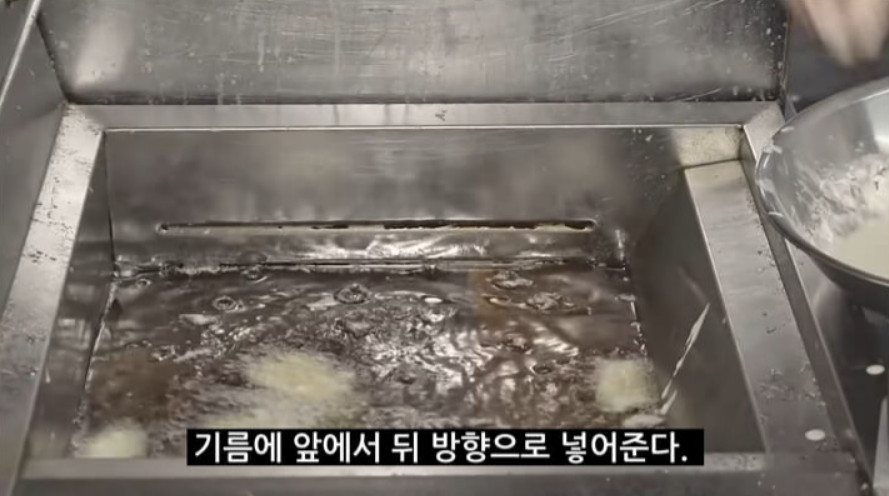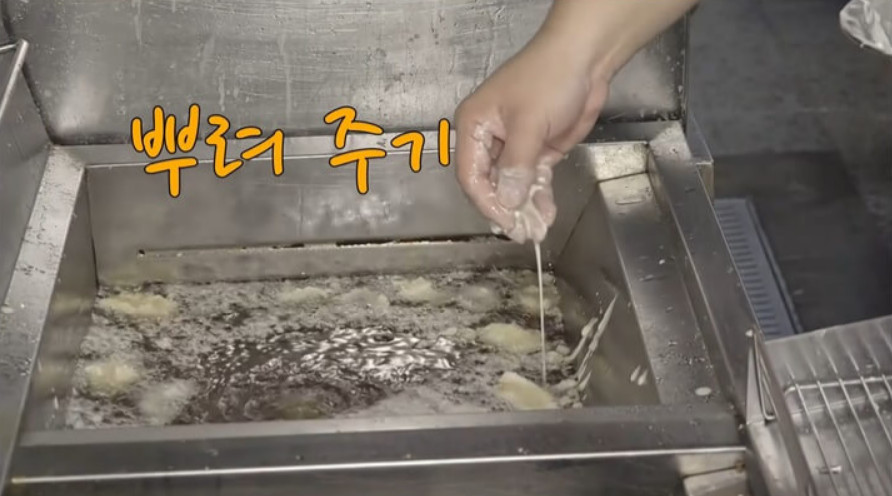 오징어를 모두 넣은 후에는 남은 반죽을 물처럼 희석해 기름 위에 뿌려주세요. 이렇게 하면 오징어 튀김에 반죽이 달라붙어 꽃처럼 바삭하게 튀겨진답니다. 오호~! 이런 방법이 있었군요!