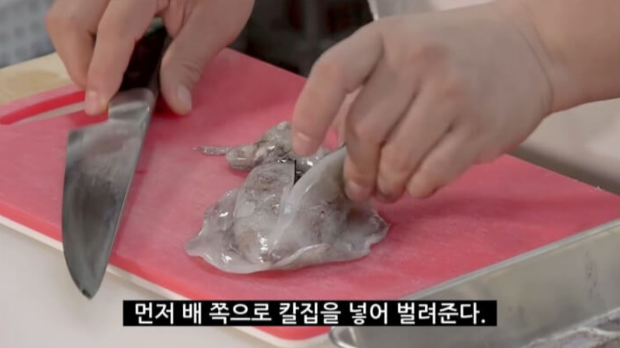 오징어의 배를 반으로 갈라주고, 다리를 잡아 머리 쪽으로 쭉 당겨 떼어냅니다. 이후 눈알과 내장을 먹통에 피해 잘라내면 됩니다.