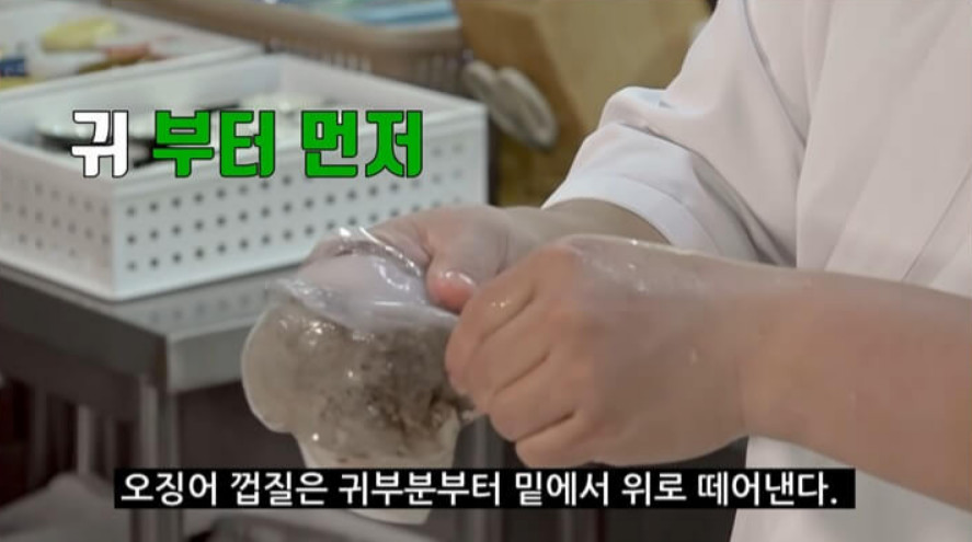 오징어 껍질을 벗길 때는 귀 부분부터 아래에서 위로 떼어냅니다. 남아 있는 껍질은 몸통 아래에 살짝 칼집을 낸 후 키친타올로 문질러 주면 깨끗하게 벗겨집니다.