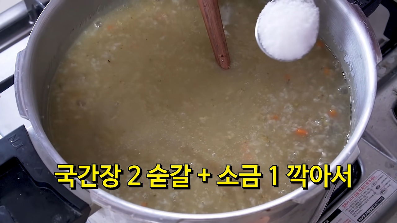 전복죽을 맛있게 끓이는 마지막 단계는 간 맞추기입니다. 국간장 2스푼과 소금 1스푼을 넣어 간을 조절해 주세요.