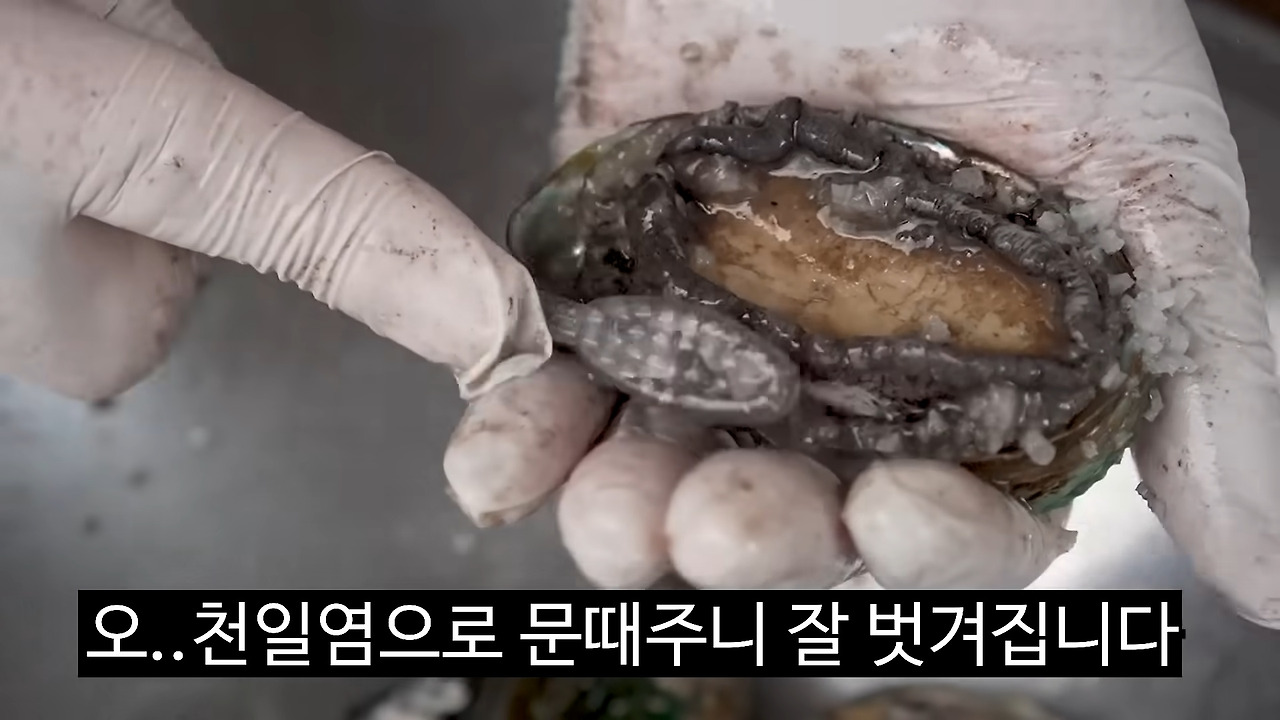 보세요, 완전 깔끔해졌죠?! 저도 이렇게 깨끗해진 걸 보고 깜짝 놀랐답니다ㅎㅎㅎ 검은 물때가 완전히 사라지고, 마치 속살이 뽀얗게 드러난 것처럼 깨끗해졌어요! 전복 손질의 첫 단계는 바로 천일염으로 문질러 씻는 거라는 것, 이제 확실히 아셨죠?