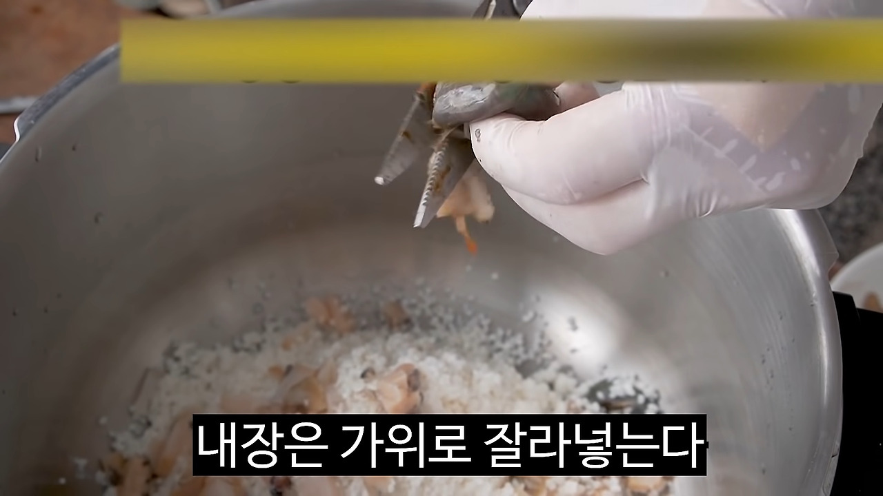 먼저 냄비에 잘게 간 쌀을 넣고, 썰어둔 전복을 함께 넣습니다. 그 다음 내장은 가위로 잘게 잘라 넣어주세요. 내장은 굳이 믹서기에 갈 필요 없이, 가위로 자르기만 해도 충분히 색감이 나오고 맛이 좋아요.