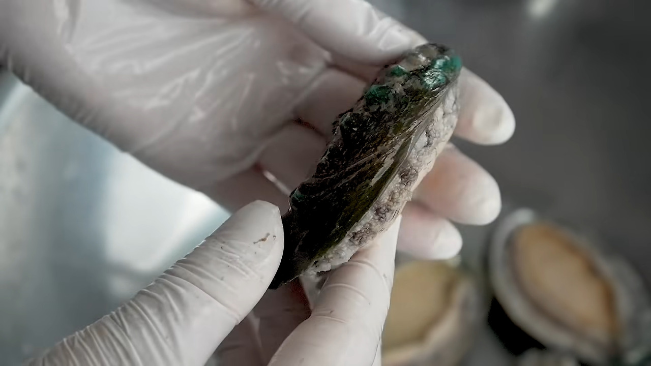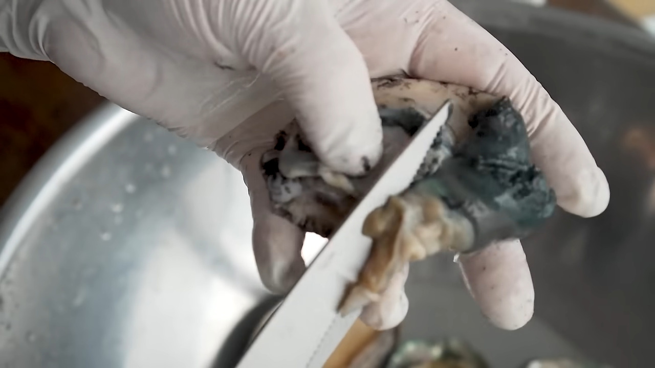 전복이 껍데기에 바짝 붙으면, 이때 손질하는 방법은 칫솔을 이용해 껍데기, 살, 그리고 옆면을 꼼꼼히 문질러 닦아주는 거예요. 전복에서 검은 물때가 많이 나올 수 있는데, 껍데기와 살 사이 그리고 옆면의 구석구석까지 깨끗이 닦아주면 됩니다. 천일염으로 문지르면 물때가 쉽게 제거된답니다!