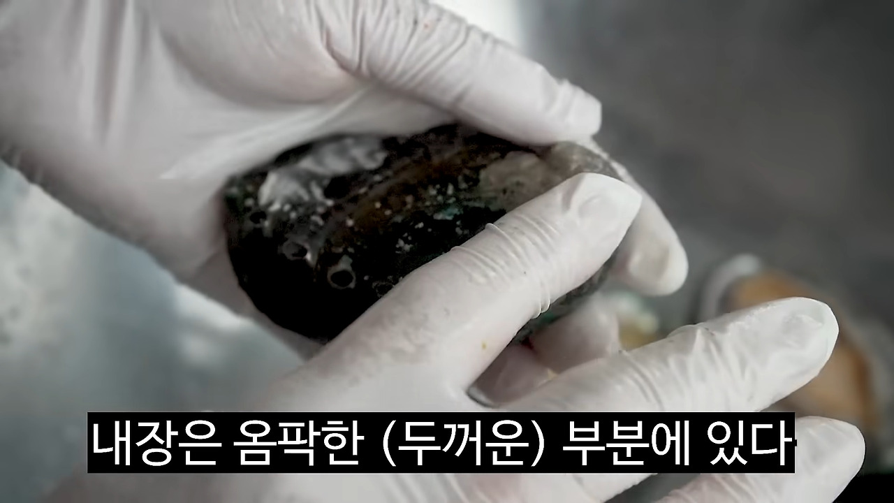 전복 손질법 세 번째 단계는 이빨 제거입니다. 내장을 제거한 전복을 보면 한쪽에 이빨이 있는데, 손으로 가볍게 눌러서 이빨을 쏙 빼내면 됩니다. 이렇게 하면 전복 손질이 완료됩니다.