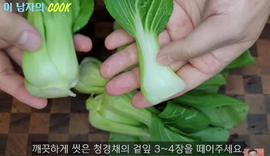 청경채는 깨끗이 씻은 후, 큰 겉잎 3~4장은 손으로 떼어내세요.