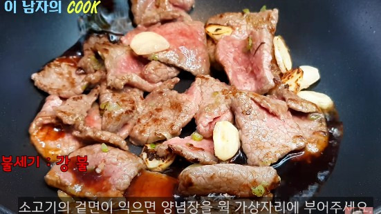 소고기 겉면이 어느 정도 익으면, 준비한 양념장을 웍의 가장자리에 따라 부어줍니다.