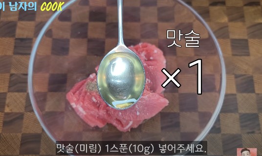 그리고 맛술 한 스푼을 넣어 고기를 부드럽게 해주고, 잡내도 없애주세요.