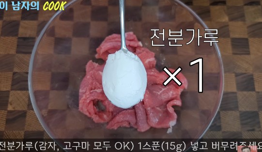 밑간이 끝난 소고기에는 전분가루 한 스푼을 추가해서 섞어주세요.