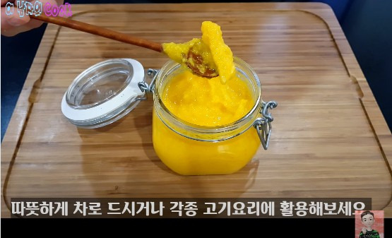 일반적으로 귤청은 귤과 설탕을 섞어 만드는데, 이남자의쿡님 레시피에는 생강도 함께 들어가요. 생강에는 항산화 성분인 진저올과 쇼가올이 들어 있어 귤과 함께 먹으면 항산화 효과가 증대되어 뼈 건강을 돕고 노화를 늦추는 데 도움을 준다고 해요. 이렇게 만든 귤청은 따뜻한 차로 즐기거나 고기 요리에 곁들여 사용하면, 고기 특유의 잡내를 없애주는 역할도 해요.