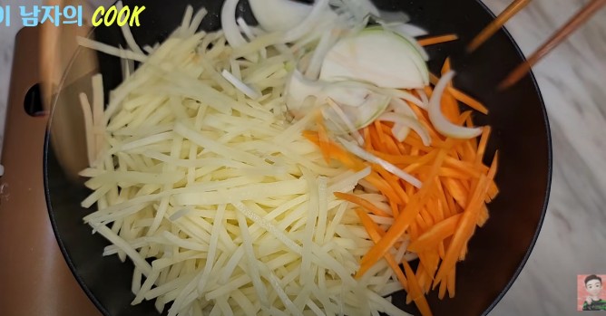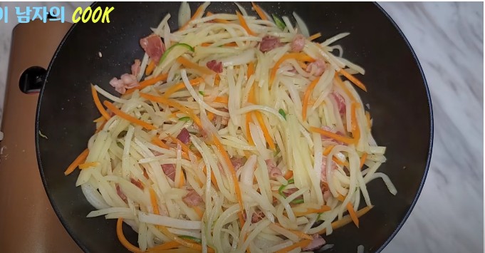 ● 베이컨에서 나온 기름을 다시 가열한 후, 감자채, 당근, 양파를 모두 넣고 함께 볶아주세요.
