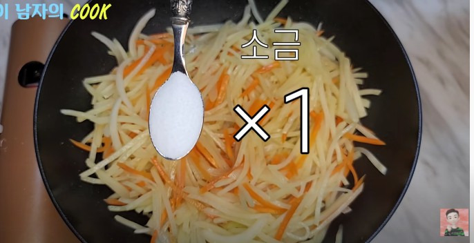 ● 감자, 당근, 양파가 기름에 잘 섞이고 살짝 숨이 죽을 정도로 볶았으면, 소금 1작은술을 넣어 간을 맞춰주세요.