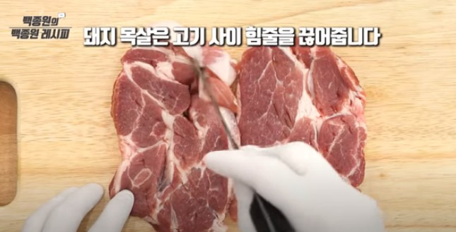 돼지목살을 준비할 때 고기 사이에 있는 힘줄을 잘라주세요. 이 작업은 고기가 익으면서 모양이 틀어지는 것을 방지하기 위함이에요. 또한 바깥쪽의 지방이나 힘줄을 잘라주면 돈까스를 만들 때도 유용합니다. 그 다음 돼지고기 목살에 소금과 후춧가루를 고루 뿌리고, 손으로 고기를 가볍게 두드려 밑간이 잘 배도록 해주세요.