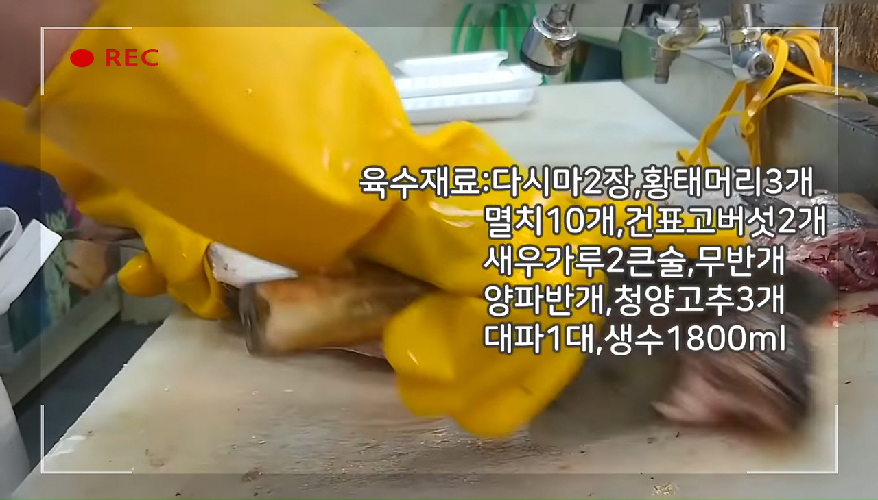 육수재료 : 다시마2장, 황태머리 3개, 멸치10개, 새우가루2큰술, 무 반개, 양파 반개, 청양고추 3개, 대파1대, 생수1800ml