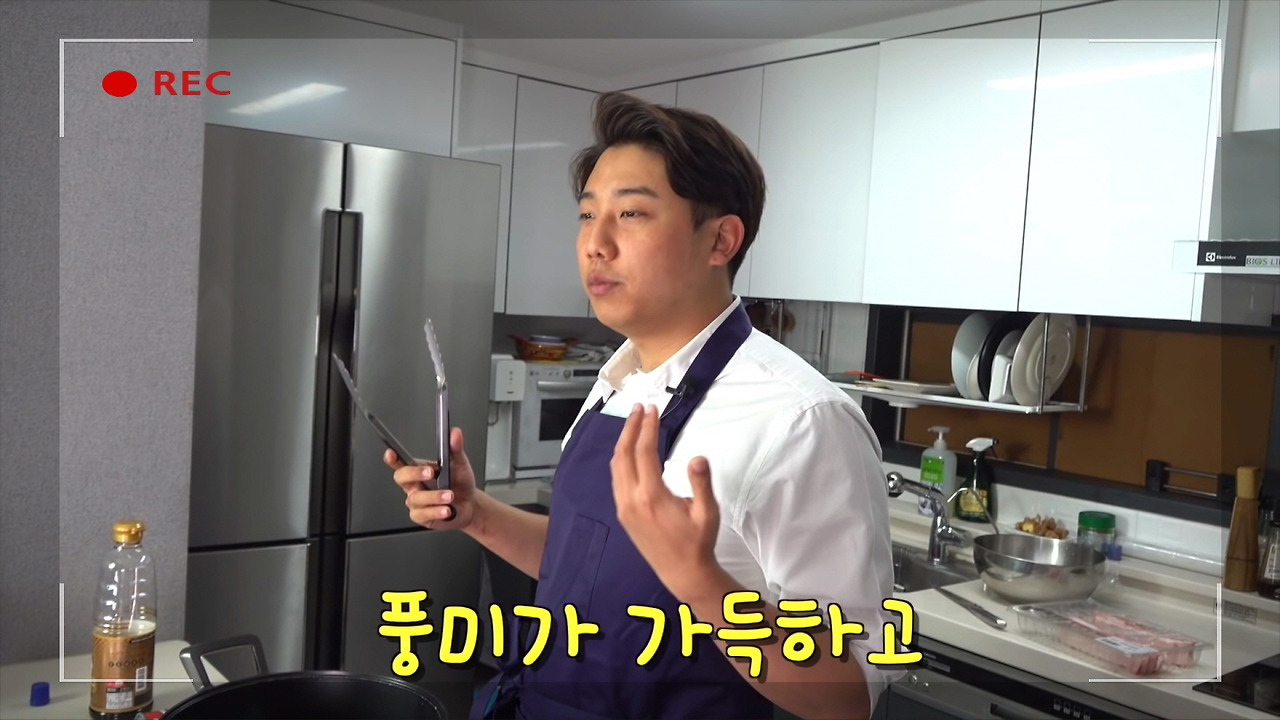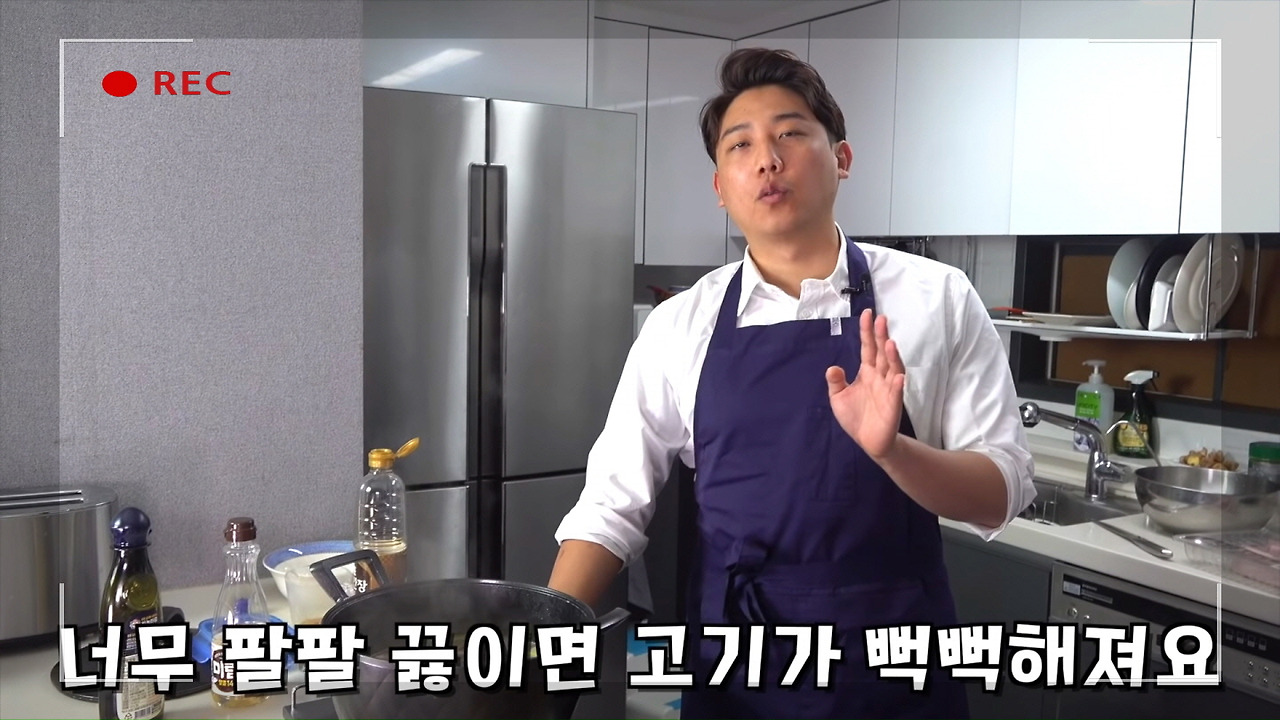 전에 넣은 미림의 알콜 성분이 돼지고기의 잡내를 없애고 날아가도록 한 번 세게 끓여주세요.