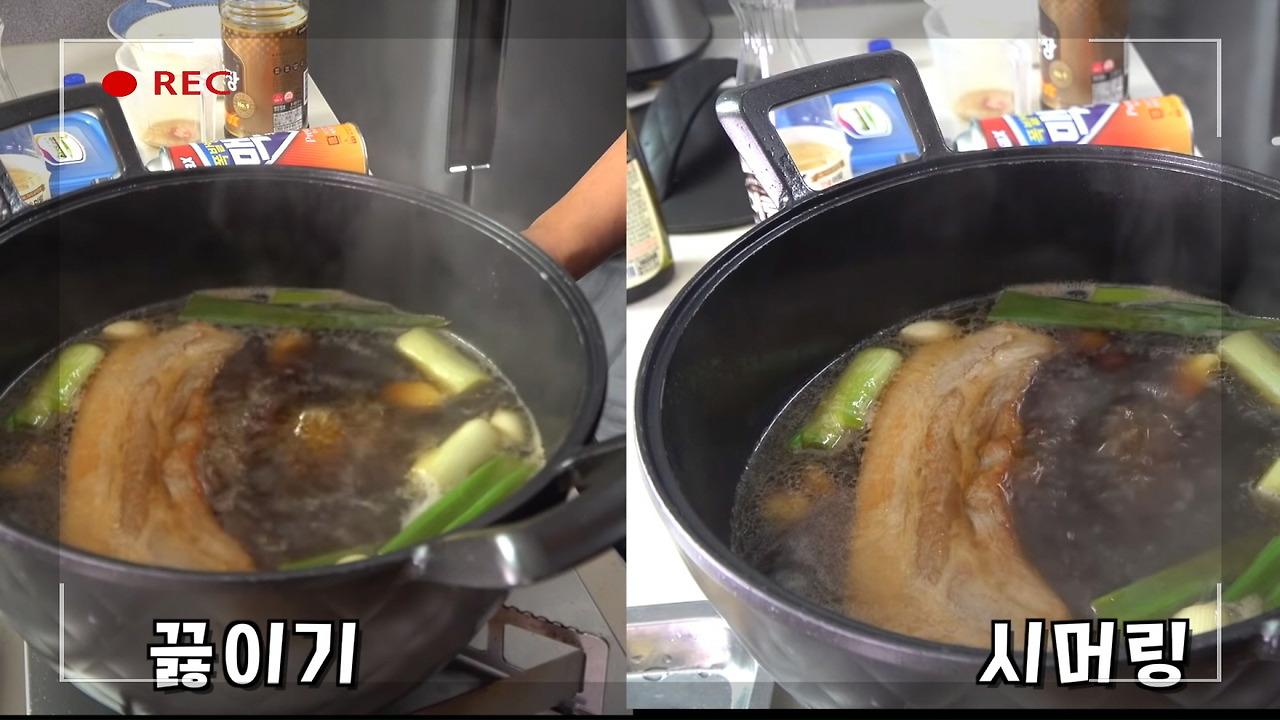이제 본격적으로 수육을 어떻게 삶는지 알려드릴게요. 사실 이 과정에서도 중요한 팁이 하나 있는데, 바로 시머링 기법이에요.