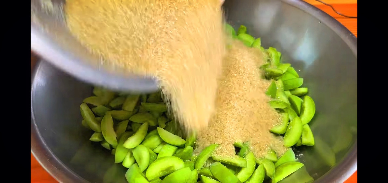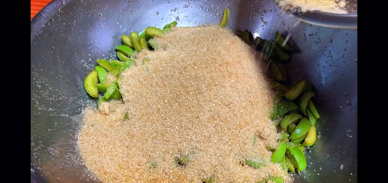 이제 본격적으로 매실장아찌를 담가보겠습니다. 잘라둔 매실에 원당(정제하지 않은 설탕) 700g을 넣고 잘 섞어준 후, 실온에 하루 동안 숙성시켜 매실이 잘 절여지도록 해주세요.