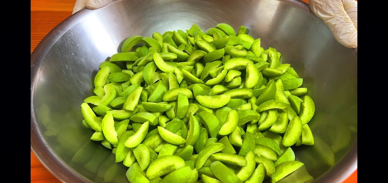 이렇게 깨끗하게 손질된 매실을 먹기 좋은 크기로 작게 썰어주세요. 일정한 크기로 자르면 더 보기 좋고, 먹기 편한 매실장아찌를 만들 수 있어요.